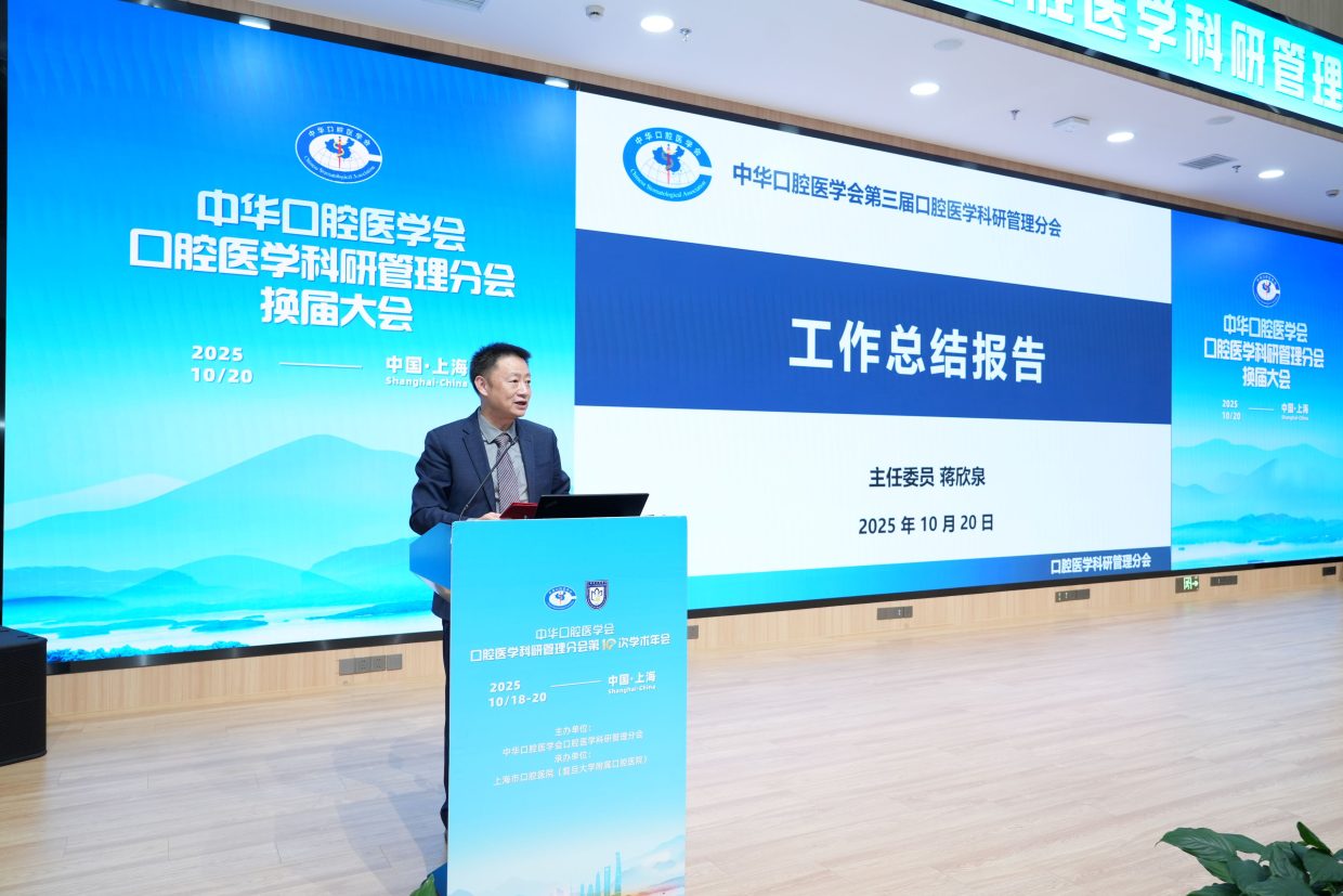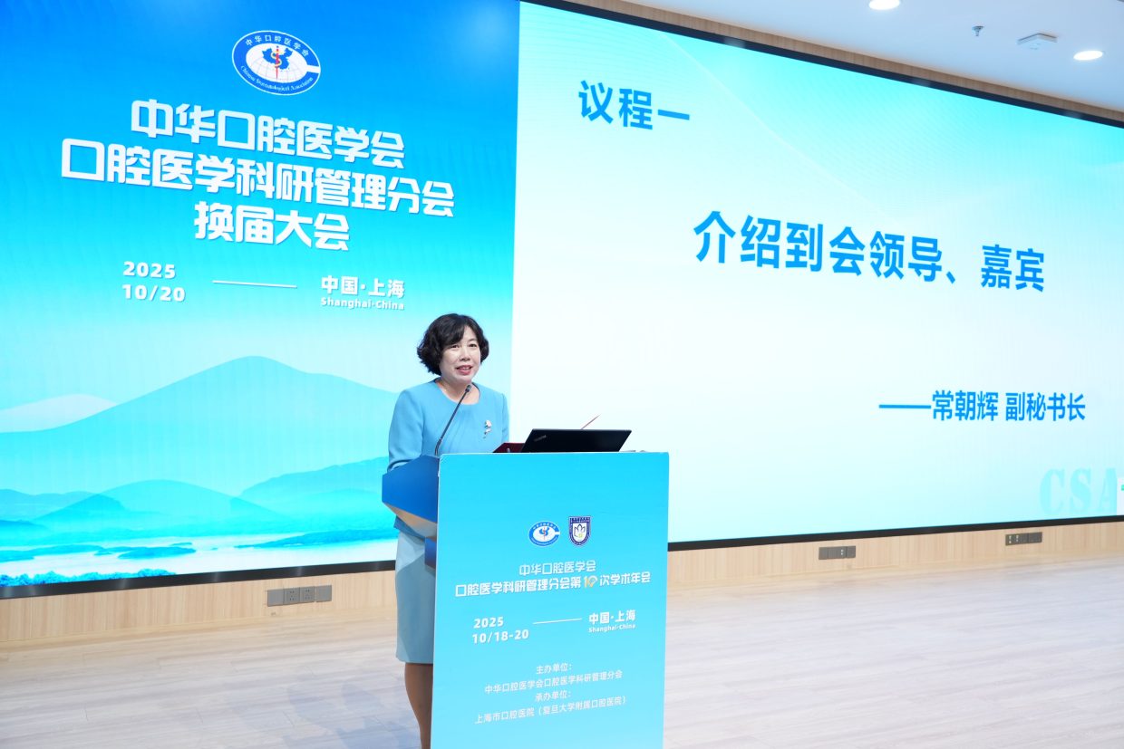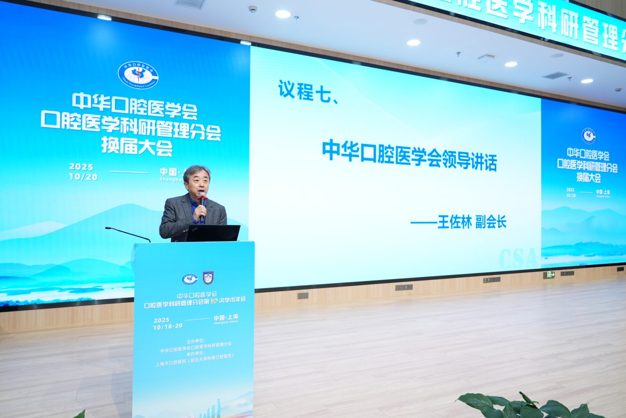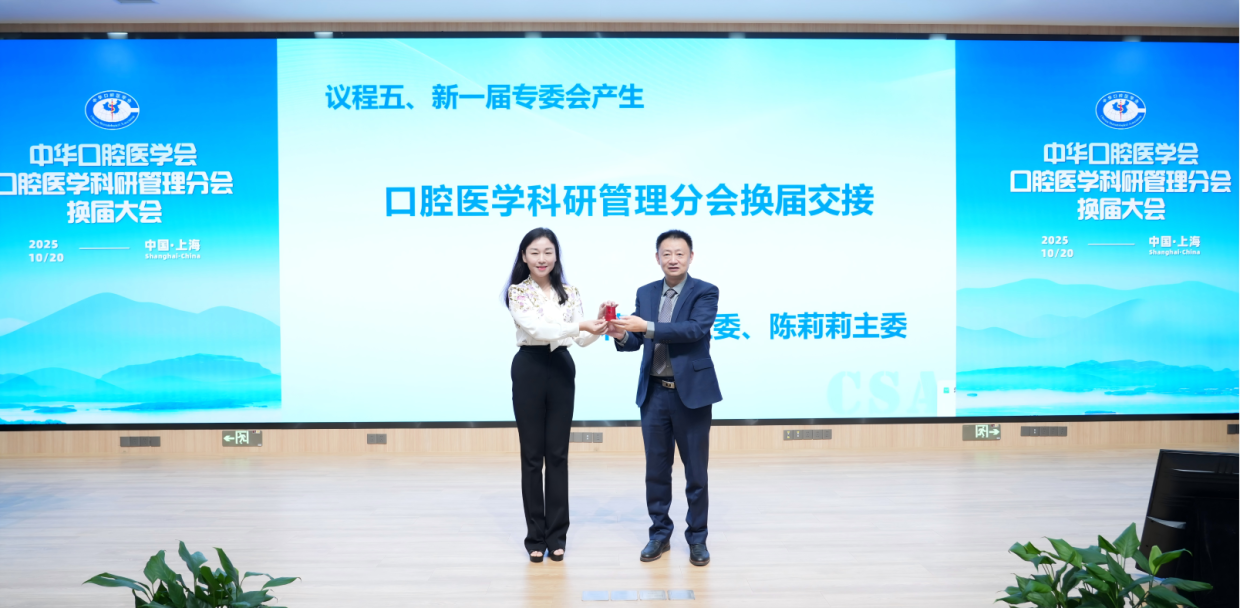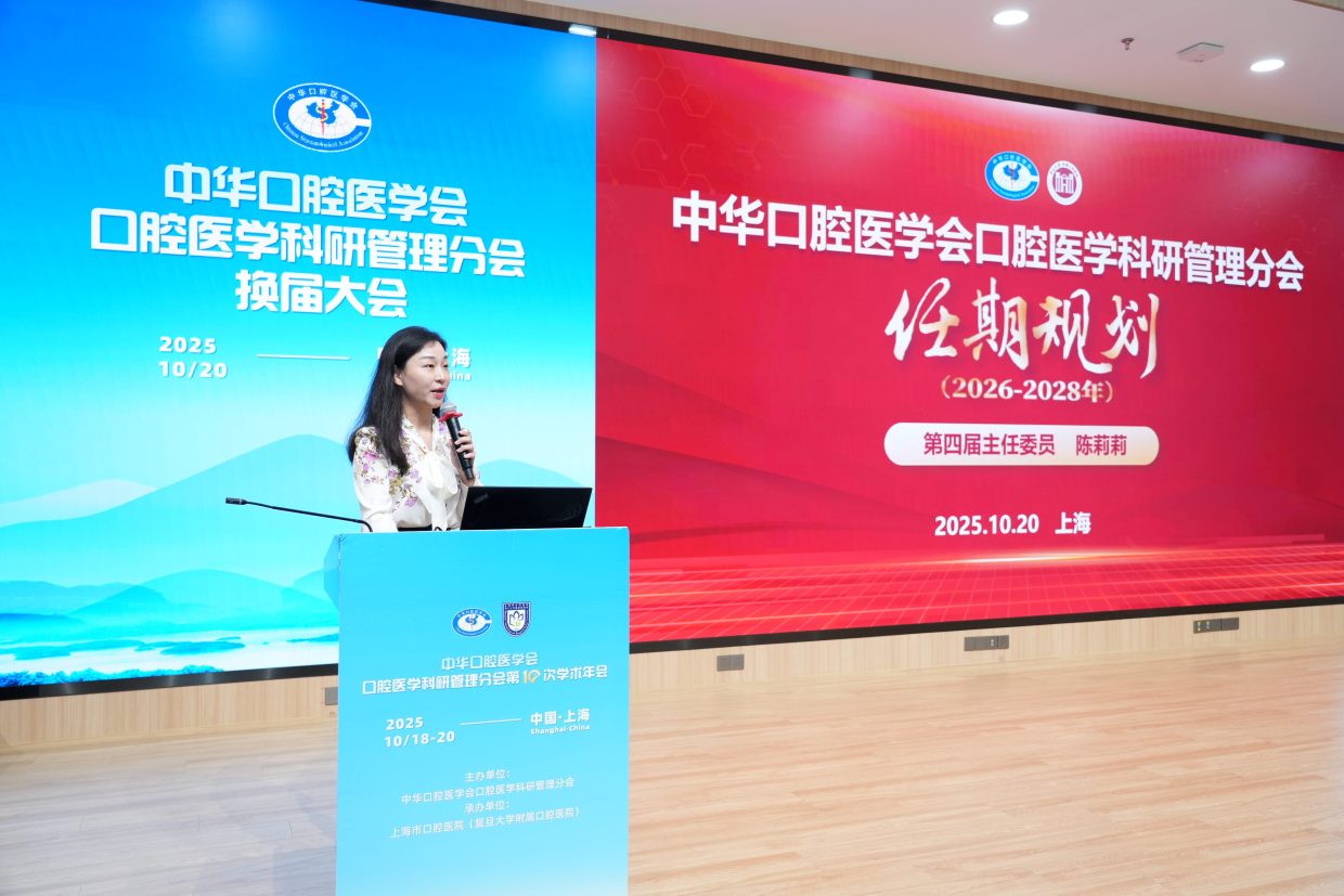 2025年10月20日,中华口腔医学会口腔医学科研管理分会在上海召开换届大会。第四届分会由95名委员组成,选举产生32名常务委员,中山大学附属口腔医院陈莉莉教授当选主任委员,候任主委为空军军医大学第三附属医院陈发明教授,副主委为(按姓氏笔画排序):卫彦、张文杰、 张玉峰、陈谦明、邵龙泉、范志朋、林云锋、蒋欣泉。王佐林副会长出席会议并讲话,对第三届分会的各项工作表示肯定,希望第四届分会发挥学术引领作用,搭建高质量交流平台,加强学风建设,促进青年人才健康成长。常朝辉副秘书长主持换届大会。